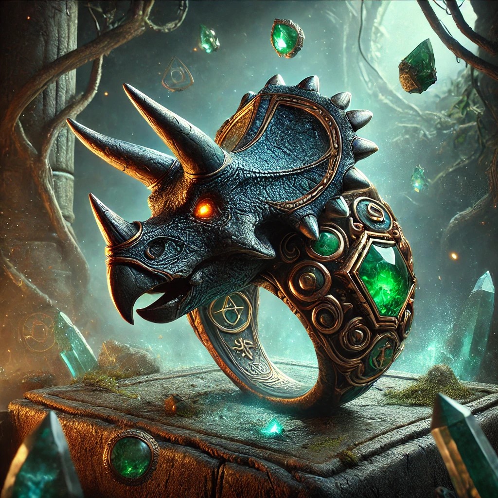 A mystic Triceratops ring resting on an ancient stone pedestal entwined with vines and surrounded by glowing crystals. The Triceratops’ head is the ring’s centerpiece, with three sharp, gleaming horns and a bony frill adorned with intricate magical symbols. Its rugged, armored body curves elegantly around the band, shimmering in shades of jade, emerald, and bronze. The Triceratops’ eyes are amber stones that emit a soft, protective glow.