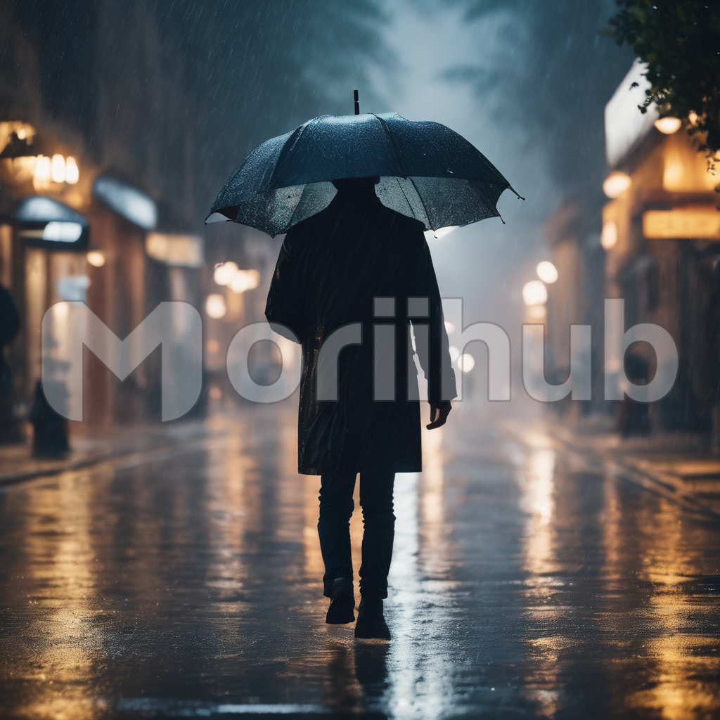 Amidst the soothing pitter-patter of rain, a lone figure strides through the wet night streets. A sturdy umbrella shields him from the downpour, its silhouetted frame adding an air of mystery. The dimly lit surroundings glisten with raindrops, and the rhythmic sound of water on pavement creates a serene symphony. In this tranquil nocturnal walk, the man finds solace and beauty in the gentle embrace of the rainy night.