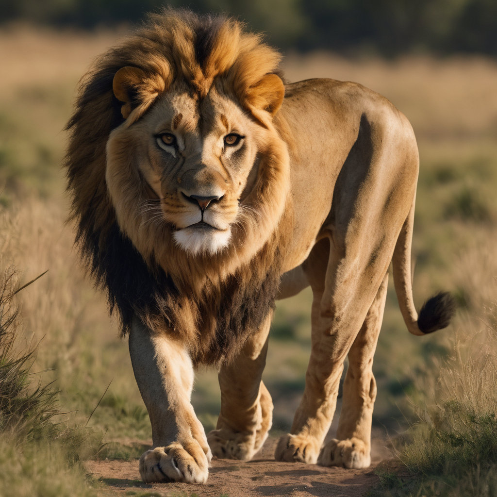 A hunting lion embodies primal grace, its sleek form melding with the savannah’s golden hues. Stealth personified, it stalks with feline prowess, amber eyes fixated on prey. Sinewy muscles ripple beneath its fur as it readies for the chase, epitomizing the untamed elegance of nature’s apex predator on the African plains.