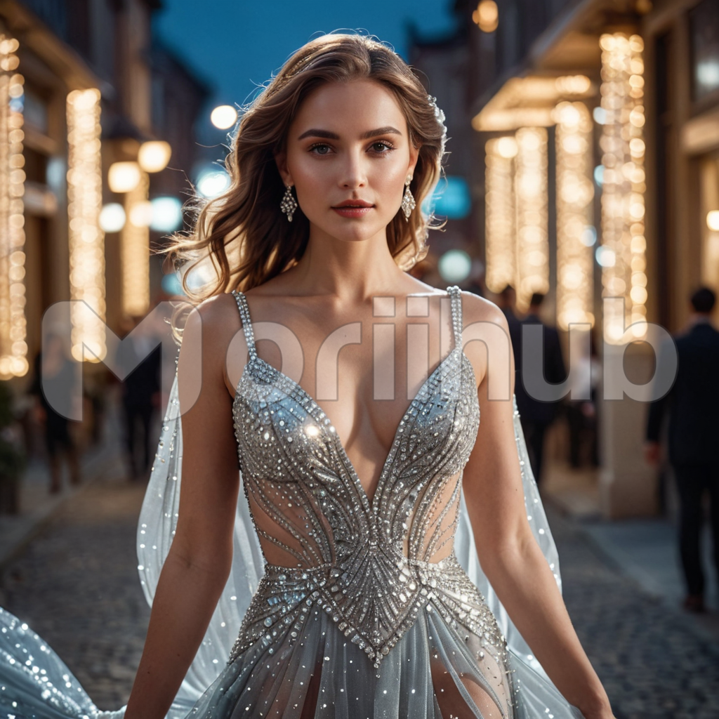 Amidst the urban hustle, a stunning woman in a flowing gown captivates the streets. Her elegance is a beacon amidst the bustling crowd, drawing glances from passersby caught in the rhythm of city life. Behind her, people buzz with activity, yet she remains the focal point, a vision of timeless beauty against the backdrop of everyday chaos. Her presence elevates the ordinary into a moment of sublime allure, a testament to the enchantment of grace amidst the urban throng.