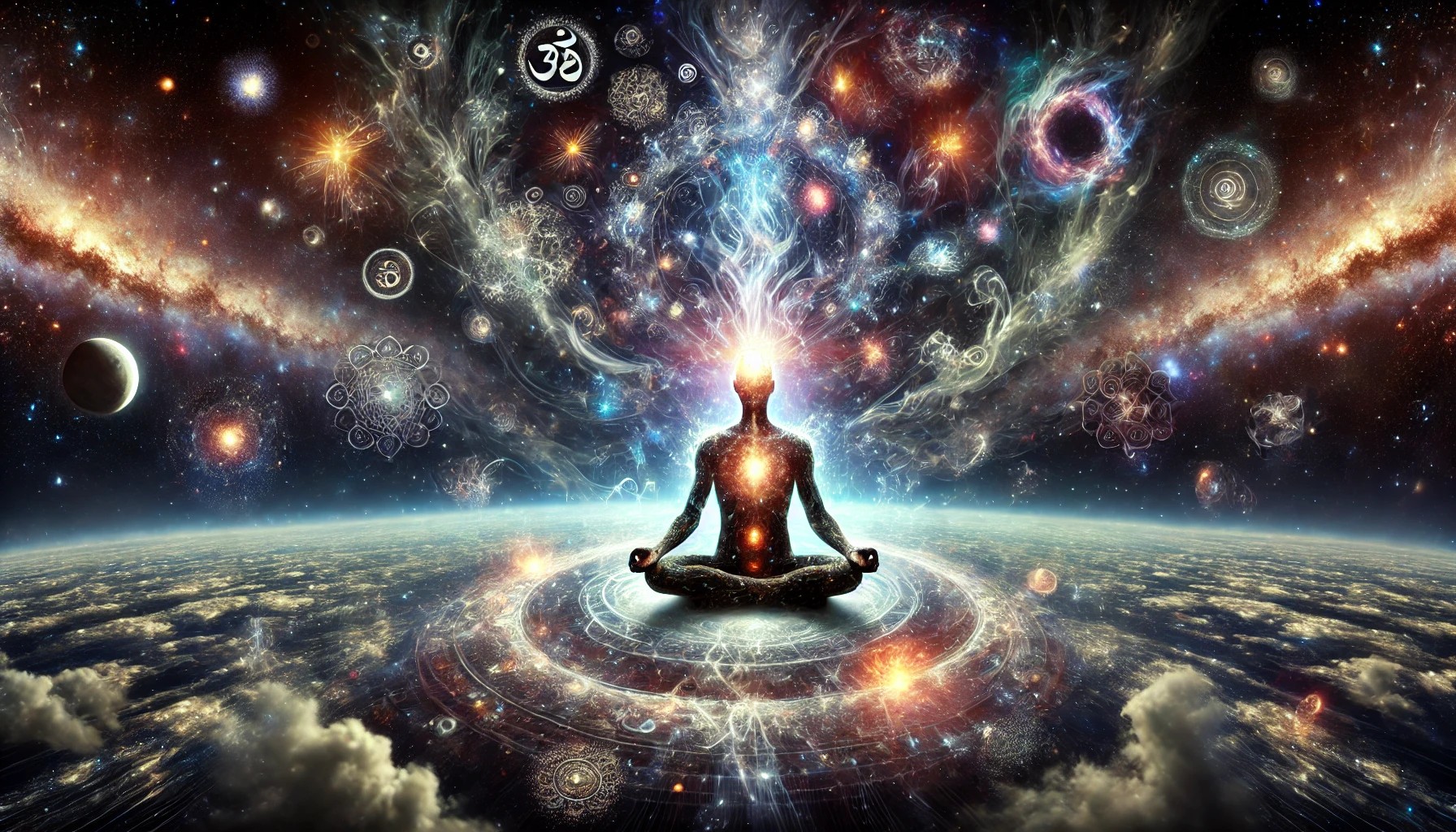 This illustration captures a surreal and mystical representation of the mind’s infinite potential. At the center of the image, a mystical figure sits in deep meditation, suspended within an endless astral plane. Their partially translucent form reveals a swirling galaxy within their body, symbolizing the vast universe of thought, memory, and consciousness.