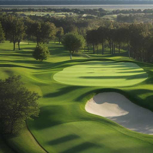 Amidst the verdant sprawl of the golf course, a mesmerizing dance unfolds as the sun casts its golden glow. Towering trees, their branches outstretched, become custodians of shadow, creating a captivating interplay of light and dark across the manicured fairways. The elongated shadows stretch languidly, like nature’s brushstrokes on the canvas of green. As golfers navigate the undulating landscape, the dappling sunlight filters through the foliage, creating a shifting mosaic of patterns. The trunks of the trees stand sentinel, grounding the ethereal beauty above. The contrast between the sunlit patches and the shaded retreats adds a dynamic quality to the course, transforming it into a serene yet lively haven where nature collaborates with the game, enveloping players in a symphony of shadows and sunlight, making each swing a poetic moment on this outdoor canvas.