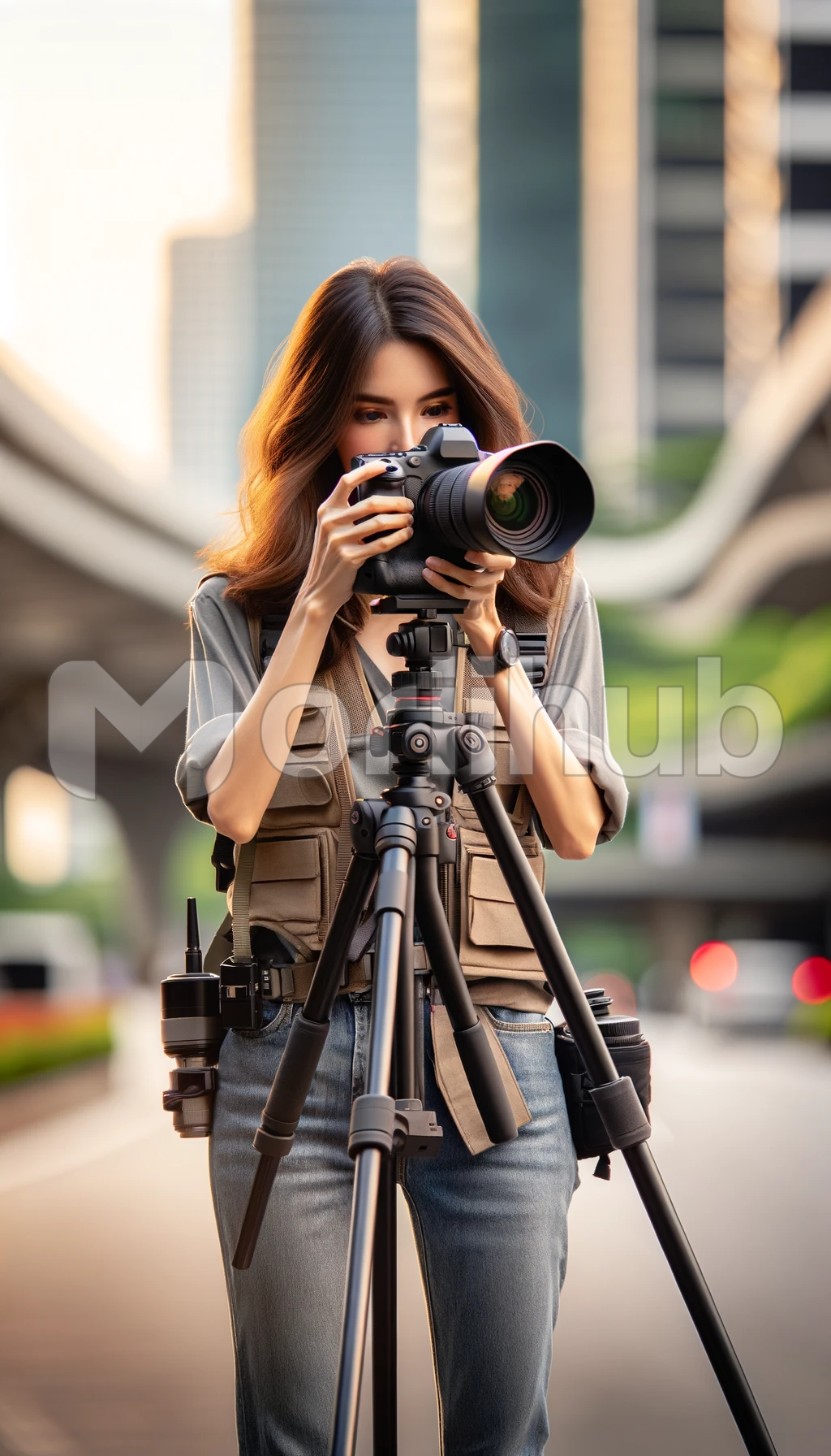 A lady photographer exudes confidence as she stands behind her camera, expertly mounted on a sturdy tripod. Her medium-length hair frames her face, giving her a professional yet approachable aura. Dressed in a photographer’s vest, she’s well-prepared with pockets filled with equipment, while her comfortable jeans allow her to move freely. She’s a skilled artist ready to capture moments with precision and creativity.