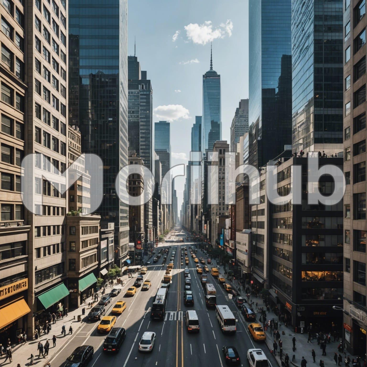 The cityscape buzzes with activity under a clear sky. Vehicles move steadily along the busy streets, flanked by tall skyscrapers and modern buildings on either side. People walk briskly on the sidewalks—some in business attire, others in casual clothes. A musician plays nearby, adding to the atmosphere. The city’s vibrant energy is palpable, a dynamic mix of movement, sound, and visual stimuli against the bright, blue sky.