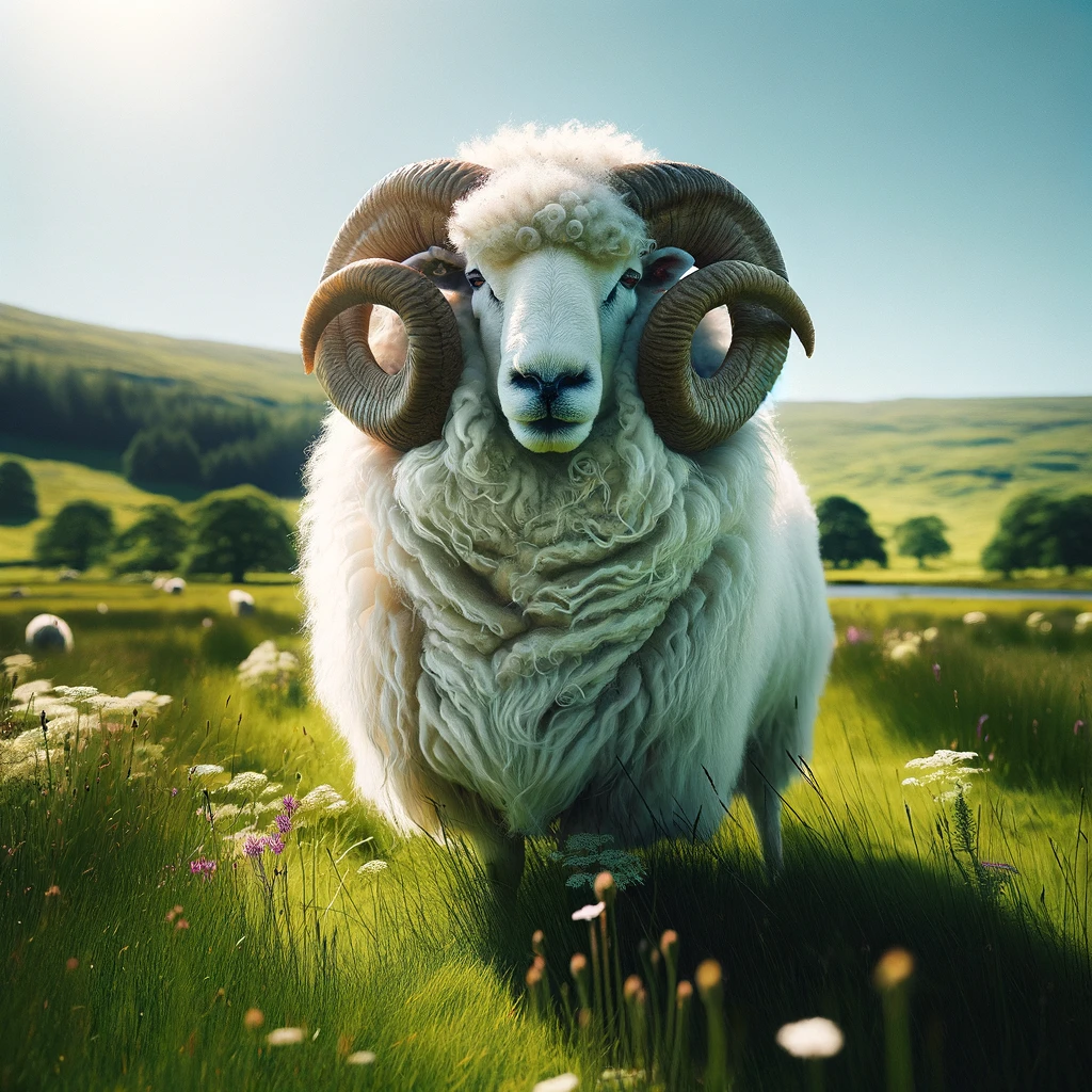 In the heart of a vibrant green meadow, a majestic white ram commands attention. Its thick, curly fur glistens under the warm sunlight, a radiant contrast against the verdant landscape. With regal poise, it stands amidst the lush expanse, a symbol of strength and beauty in perfect harmony with nature’s embrace.