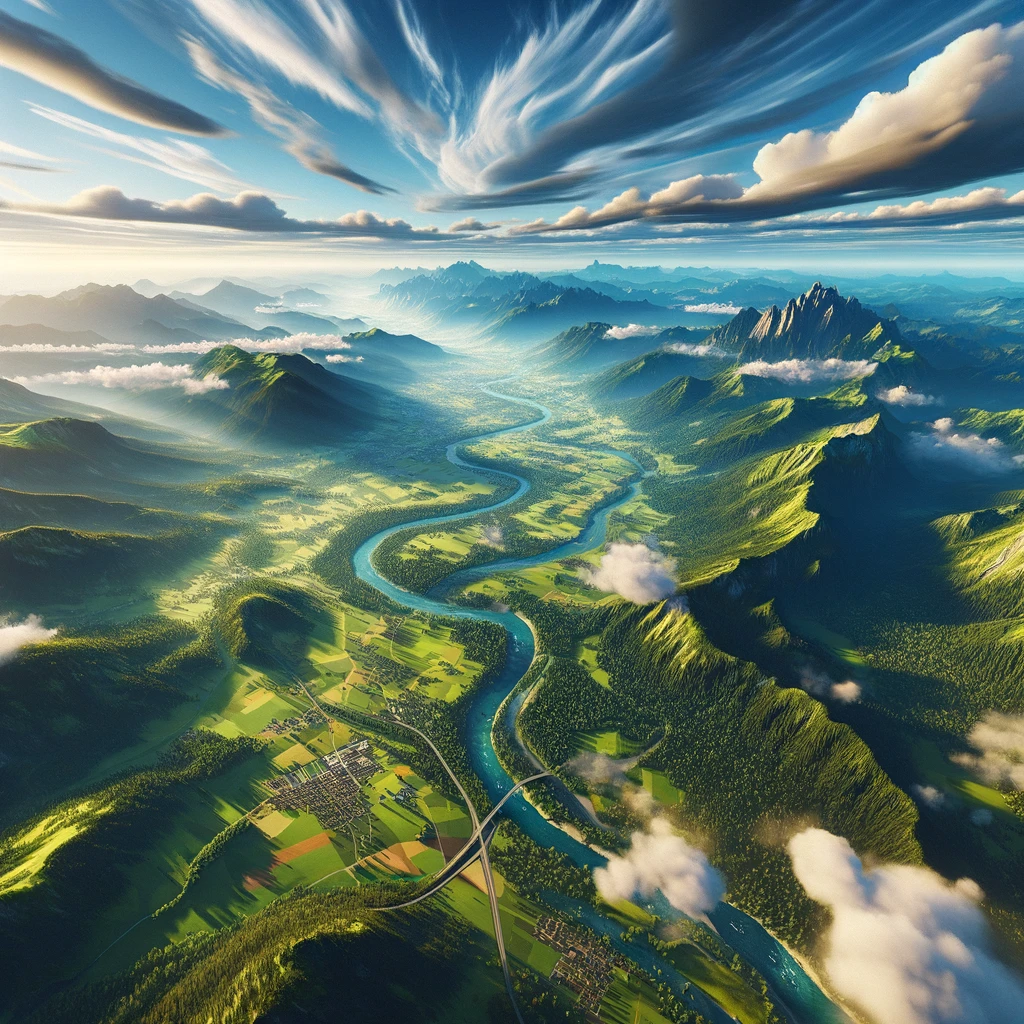 In this dynamic and immersive scene, the viewer is transported to a bird’s eye view, soaring over a vibrant and diverse landscape. Below, a patchwork of terrains unfolds – from lush forests to winding rivers, rolling hills to expansive plains, each contributing to the rich tapestry of nature’s beauty.