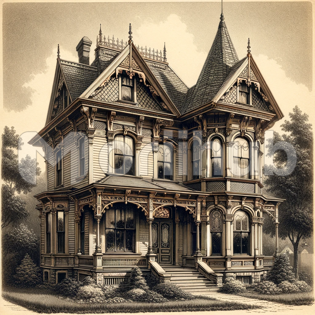 Envision a classic Victorian-era home frozen in the time of 1879. This grand house boasts the quintessential architectural elements of the era—elaborate ornamentation, steep gabled roofs, and intricate fretwork adorning its exterior. Its imposing presence is softened by the warmth of a wraparound porch, complete with delicate gingerbread trim. This Victorian gem stands as a testament to the opulence and elegance of the 19th century.
