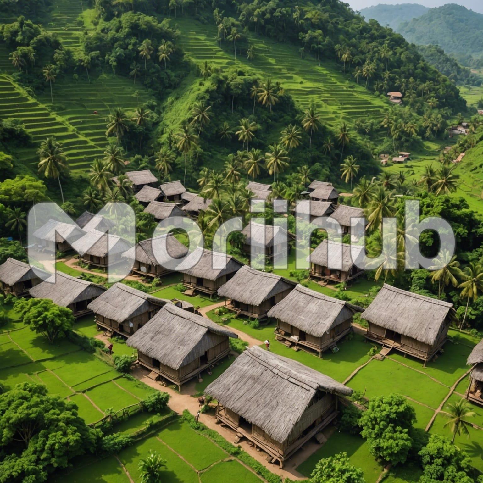 From above, the village unfolds like a patchwork quilt on the landscape, its charm evident even from the heights. Simple huts cluster amidst lush greenery, their thatched roofs blending seamlessly with the natural surroundings. Towering trees stand as guardians, adding to the tranquil tableau. Amidst this timeless scene, the village exudes a harmonious blend of human habitation and nature’s bounty, captured in the serene embrace of the land.