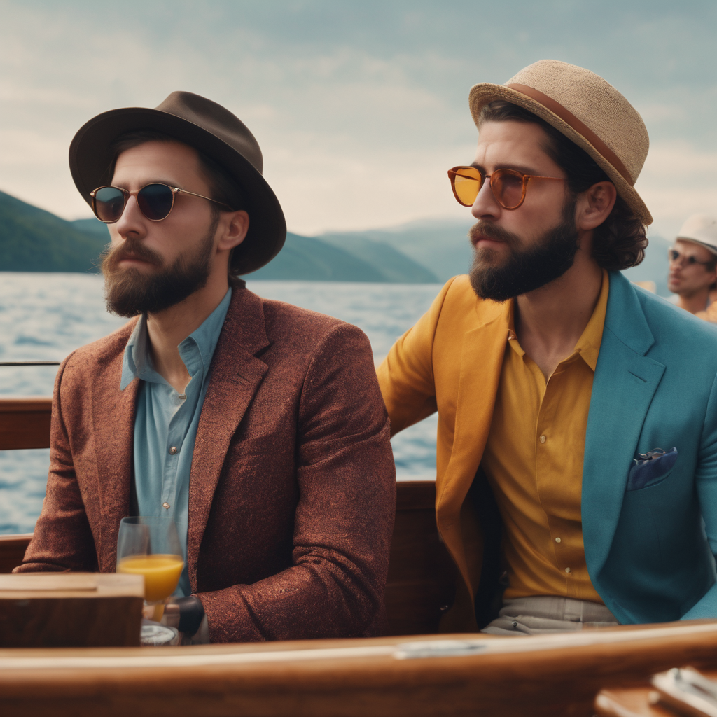 Two hipsters embark on a boat trip, their hats casting shadows over retro-inspired glasses. The rhythmic hum of the boat harmonizes with their carefree laughter. Clad in vintage attire, they navigate the water with a nonchalant elegance, embodying a timeless blend of style and wanderlust against the backdrop of a sun-kissed horizon.