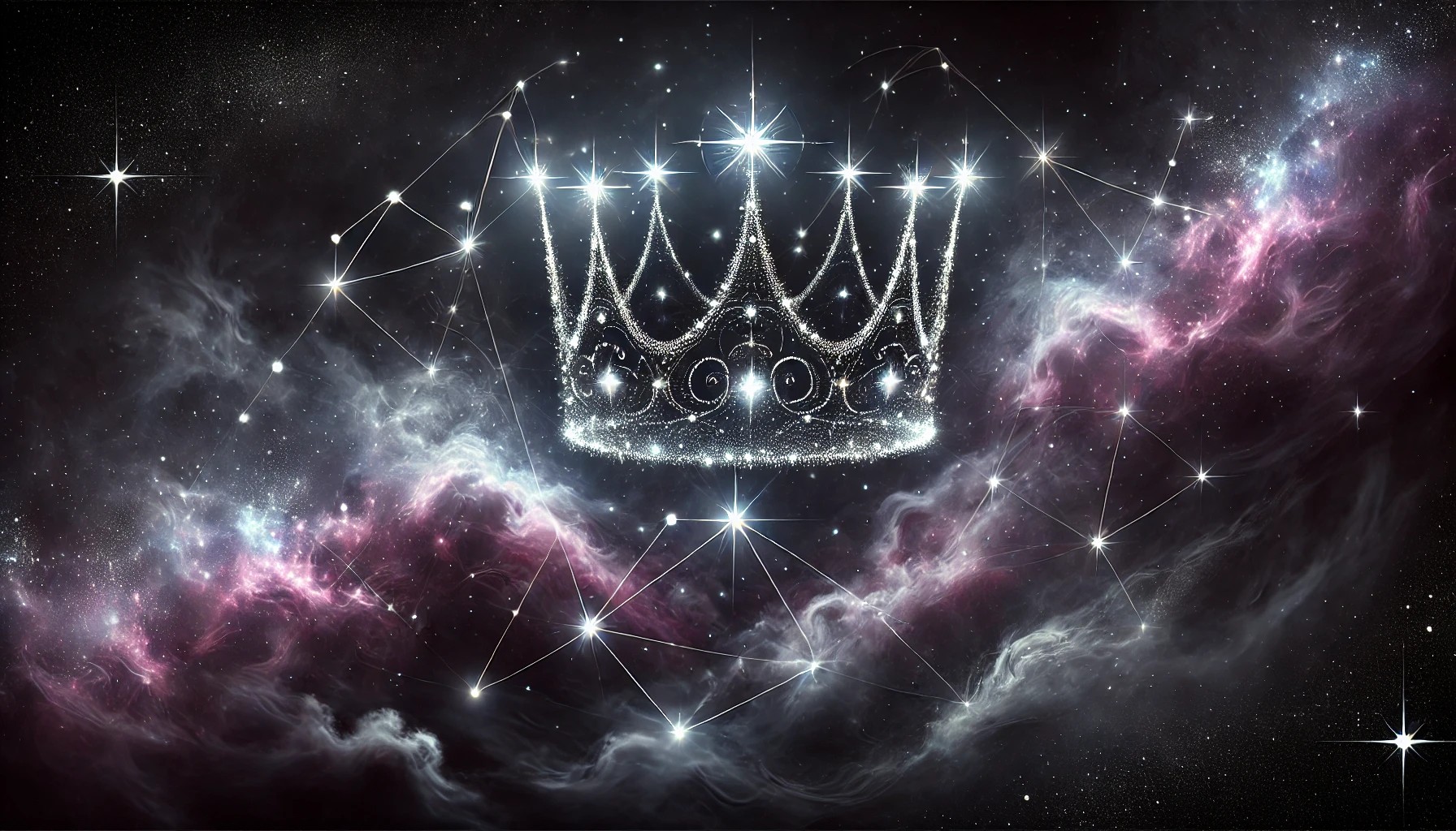 The image showcases a majestic constellation shaped like a regal crown, made of glowing stars connected by faint, shimmering silver lines. The crown’s design features pointed peaks resembling jewels, all formed from celestial light. The cosmic background is a deep, endless void, blending dark blacks with swirling purples and blues, creating a mystical, otherworldly atmosphere.