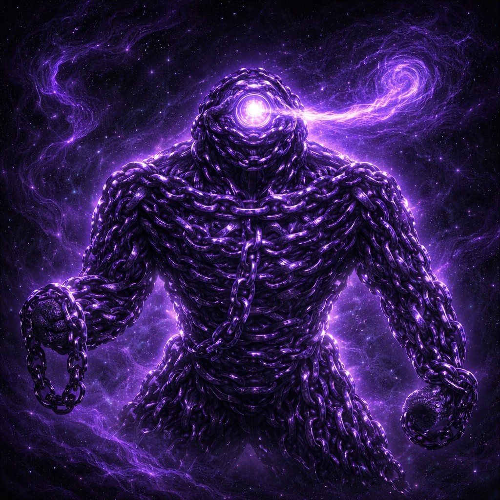 The image features a powerful and mysterious cyclops figure, constructed entirely from glowing chains of dark purple and black links. Its body is massive and imposing, with the chains intricately wound to form a humanoid shape. The cyclops has a single, intense eye at the center of its head, glowing with an eerie purple light.