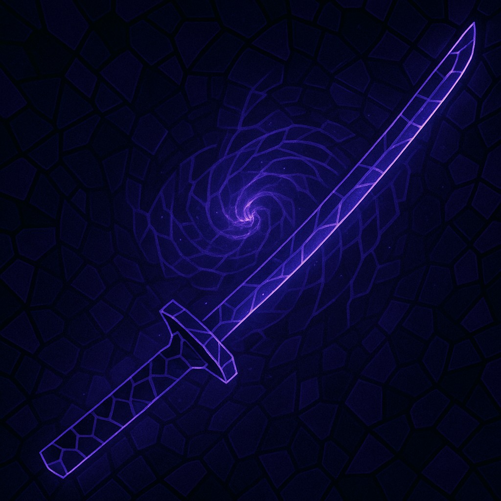 This image showcases a digital abstract mosaic of a katana infused with the void element. The katana is crafted from angular, interlocking shards resembling stained glass or crystalline tiles, forming a sleek blade. It radiates with glowing neon hues—mainly purples, blues, and black—representing the mysterious energy of the void.