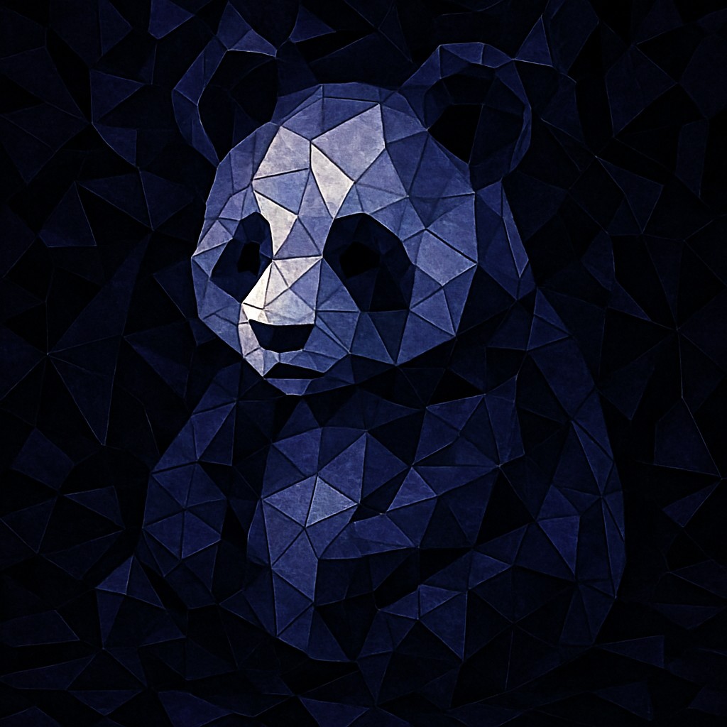 This image features a digital abstract mosaic of a panda rendered in a stylized, geometric form. The panda’s shape is composed of sharp polygonal segments, forming a fractured, crystalline surface. The color palette is dominated by dark void-like tones—deep blues, purples, and blacks—creating a mysterious and cosmic ambiance. Light grays and whites define the panda’s facial features and belly, standing out in stark contrast to the shadowy background.