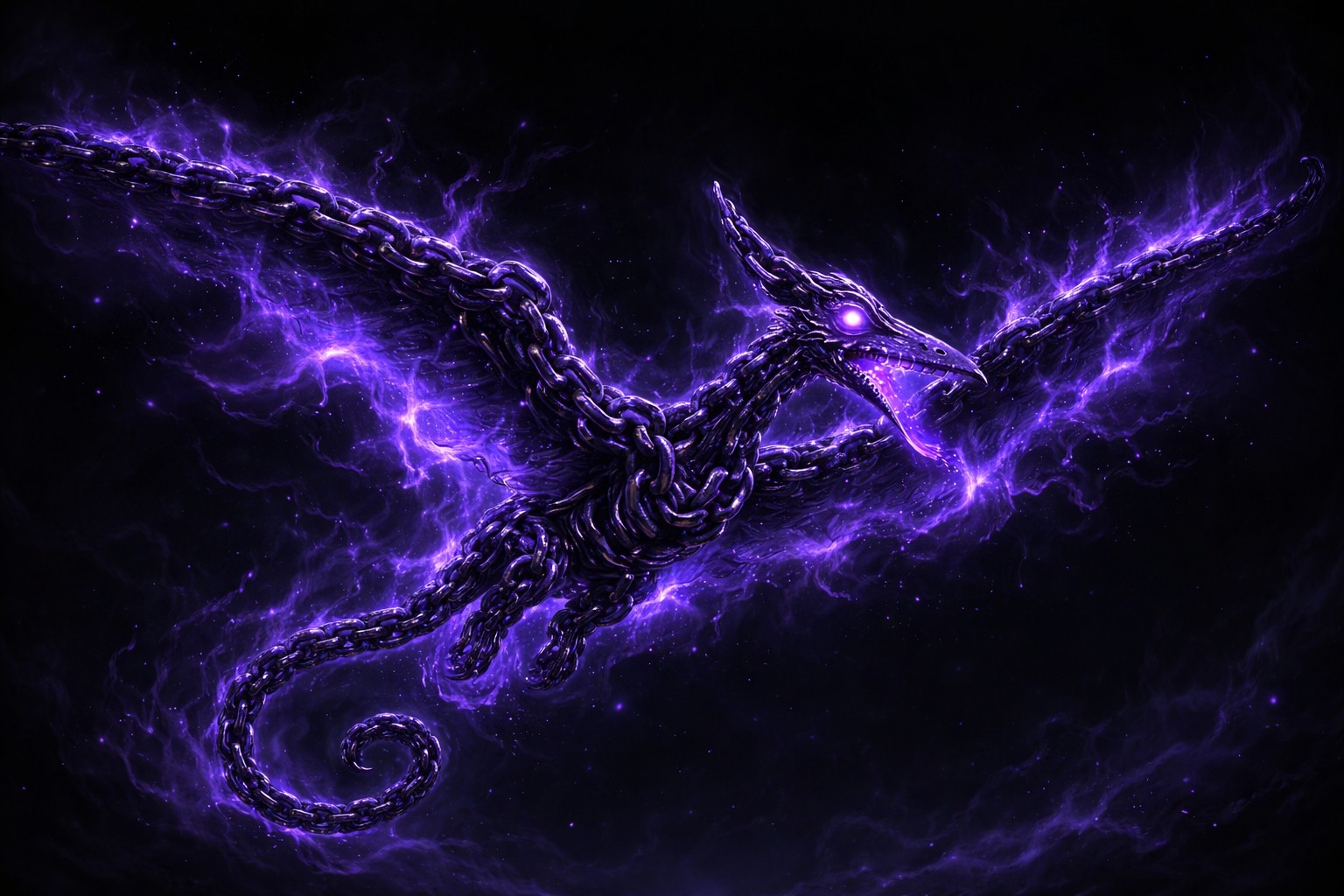 The image features a stunning pterodactyl formed entirely from dark metallic chains, its wings and body woven from interlocking links. The creature is bathed in an otherworldly glow, with ethereal tendrils of violet and purple void energy swirling around it, giving it a mystical and haunting appearance. Its eyes burn with intense violet light, and the edges of its wings seem to dissolve into the void, blending seamlessly with the cosmic energy.
