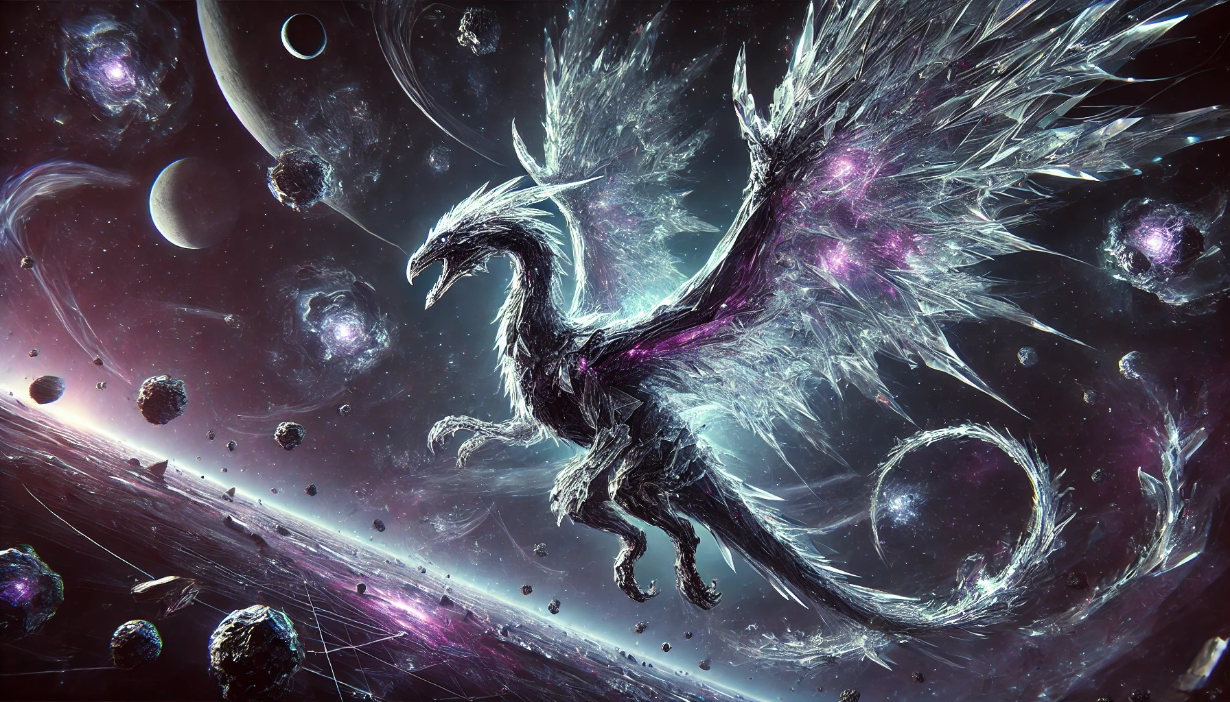 This mesmerizing artwork showcases a Crystal Pterodactyl infused with void energy, a celestial predator soaring through the endless abyss of space. Its entire form is crafted from sharp, translucent crystal shards, which seem to absorb and distort light, giving the creature an ethereal, shadowy presence. The wings stretch wide, vast and jagged, shimmering with swirling void energy that leaves behind ghostly trails as it moves through the cosmic expanse.