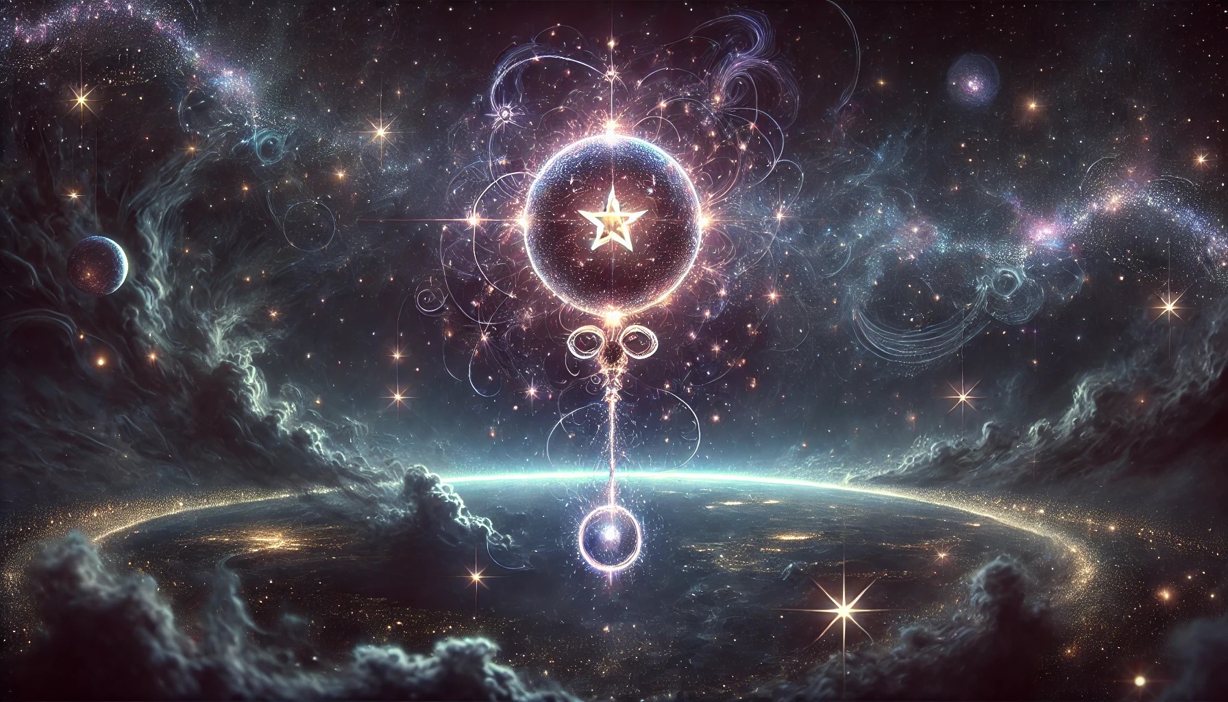 A digital artwork of a glowing constellation in the shape of a mystical scepter floating in a vast, dark cosmic void.