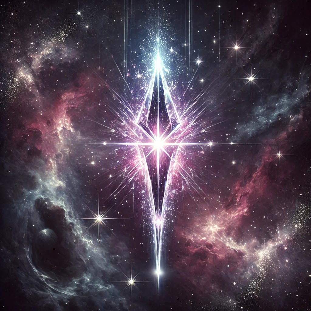 The image features a cosmic constellation in the shape of a spear, radiating an ethereal void element. The spear is outlined by shimmering star-like points, forming a sleek and sharp celestial weapon. It glows with a mix of deep purple and black energy, giving off a dark yet mesmerizing aura that blends seamlessly into the cosmic expanse.
