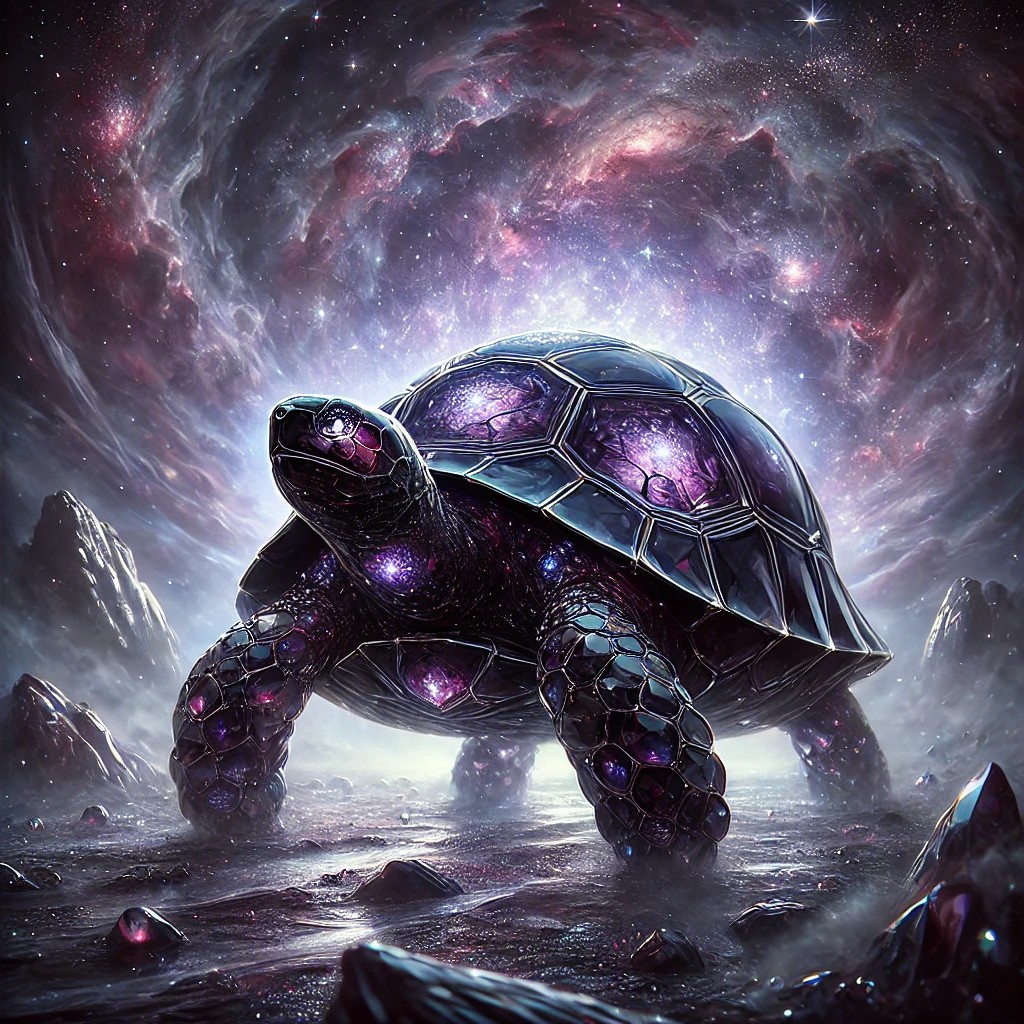 The image showcases a mesmerizing crystal turtle infused with the essence of the void element, resting in an otherworldly realm. Its body is sculpted from dark, translucent crystal, with swirling cosmic energy and tiny galaxies shimmering within its form. The turtle’s massive shell glows with deep purple and black hues, pulsating with an eerie, infinite void that seems to absorb the surrounding light.