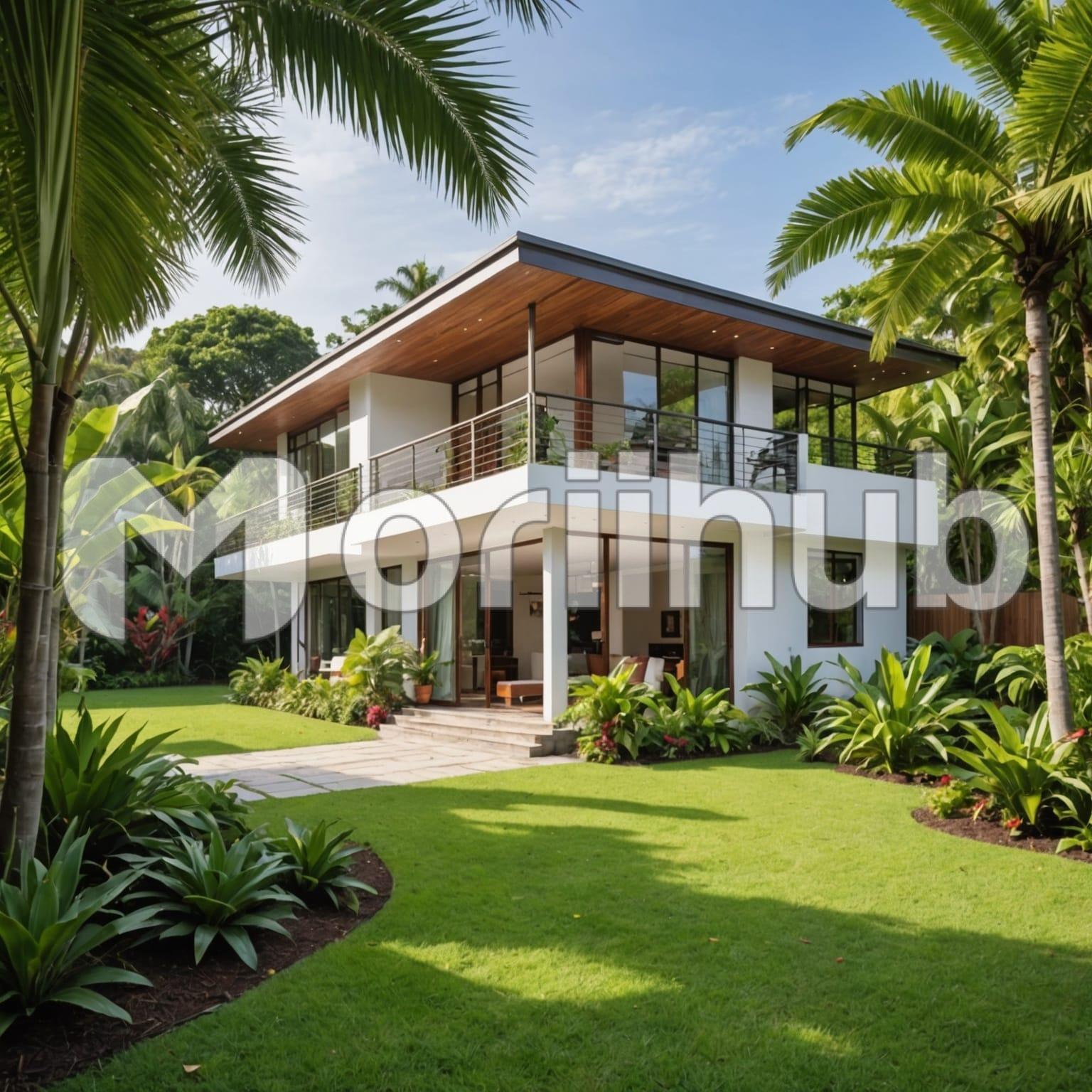 The house stands gracefully, framed by lush trees both behind and in the front yard, creating a serene atmosphere. Its inviting facade showcases a charming blend of design and warmth, with large windows that reflect the vibrant blue sky above. The greenery surrounds the property, adding a sense of tranquility and privacy. Sunlight filters through the leaves, casting shadows on the ground. This idyllic setting evokes a feeling of comfort and belonging, where the beauty of nature complements the warmth of home, inviting all to enjoy the peaceful surroundings.