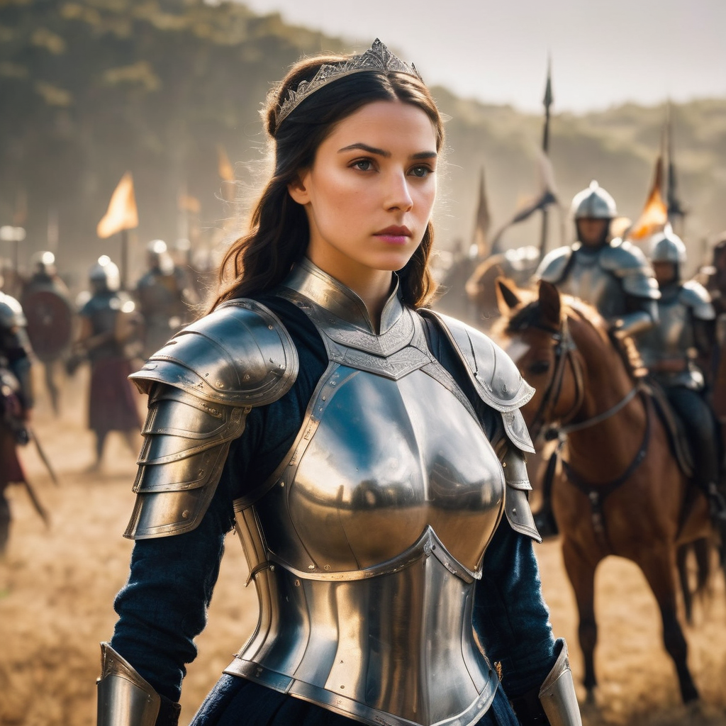Amidst the rugged terrain, a female warrior stands resolute, clad in battle-worn armor, her gaze fixed upon the horizon with unwavering determination. Behind her, fellow warriors on mounted horses ride forth, their figures silhouetted against the backdrop of towering mountains. With a steely resolve, she leads her comrades into the unknown, embodying strength and courage in the face of adversity, ready to conquer whatever challenges lie ahead on their quest for glory.