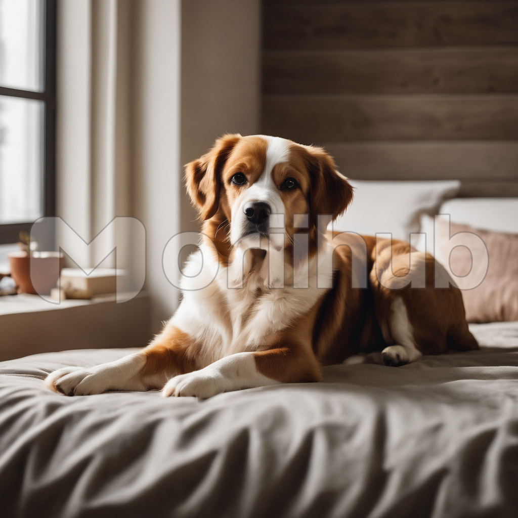 With head raised in attentive curiosity, a dog lies gracefully on a plush bed, gazing into the distance. The softness of the linens contrasts with the alertness in its eyes, capturing a moment of canine contemplation. Ears perked and eyes focused, the dog embodies a blend of relaxation and watchfulness, creating a heartwarming scene of companionship and loyalty in the tranquil embrace of a beloved bed.