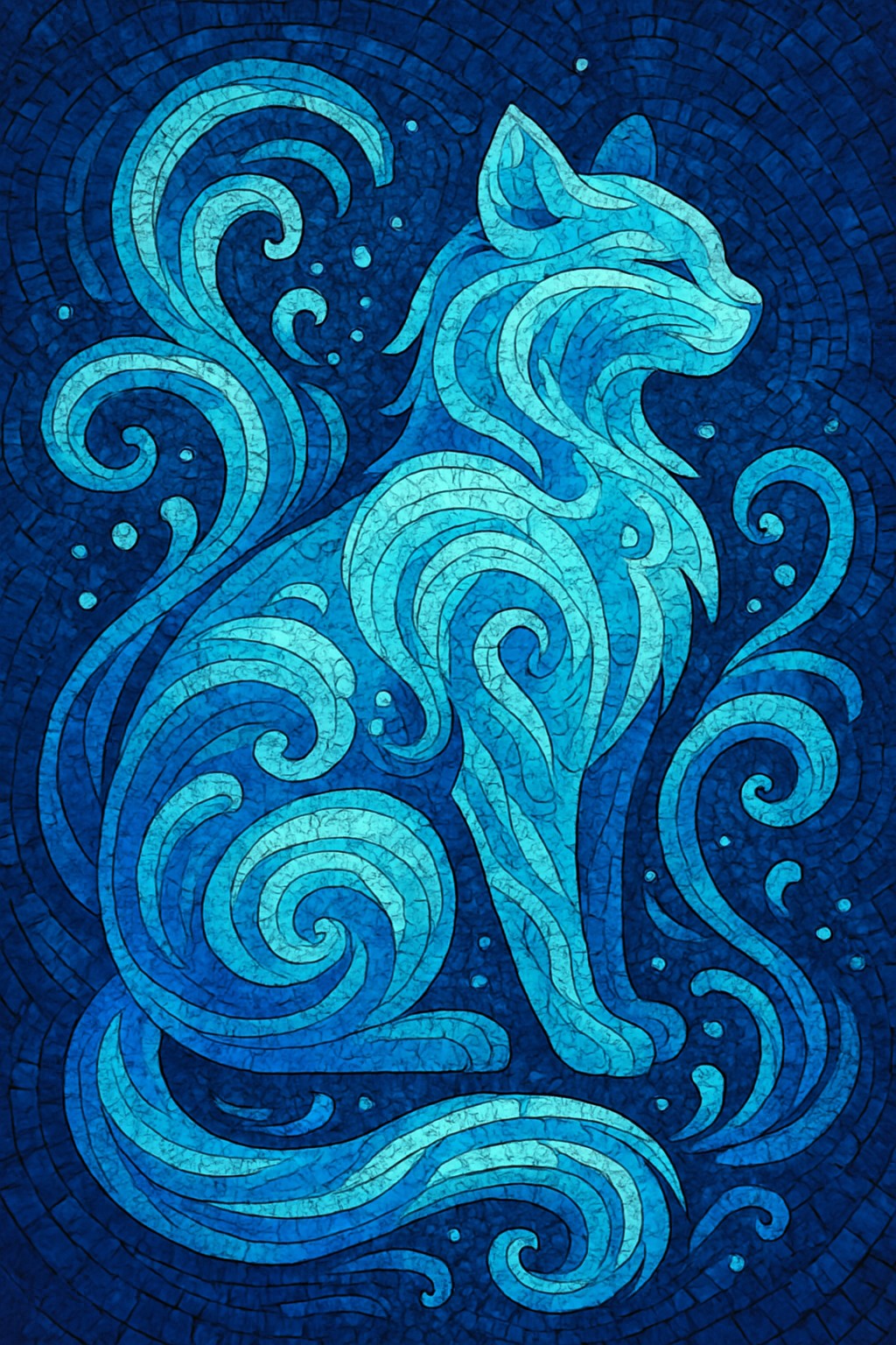 This image is a digital abstract mosaic artwork featuring the silhouette of a cat formed entirely by swirling, wave-like patterns. The entire composition is infused with the water element, using a palette dominated by deep blues and aquamarines. The cat is shown in a graceful, seated profile, its body outlined and filled with dynamic, curving lines that mimic the fluid motion of water.
