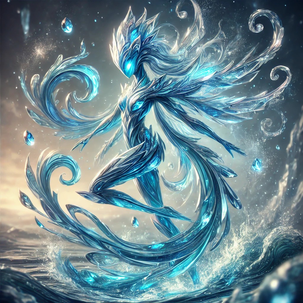 A majestic water elemental takes form, crafted entirely from translucent, shimmering blue and aqua crystal. Its humanoid shape flows gracefully, with smooth, fluid curves that mimic the constant motion of water. The elemental’s body seamlessly shifts between solid crystal and swirling streams of water, giving it a mystical, ever-changing appearance.