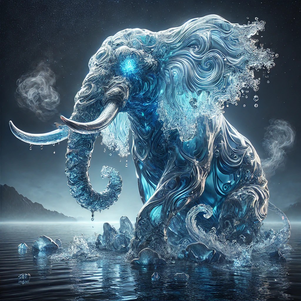 The image features a breathtaking elephant sculpture made entirely of shimmering, translucent blue crystal, infused with the essence of water. Its body appears to be in a constant state of motion, with swirling currents and suspended water droplets frozen in time. The elephant’s tusks glow with an ethereal cyan hue, while its deep oceanic blue eyes radiate a mystical energy.