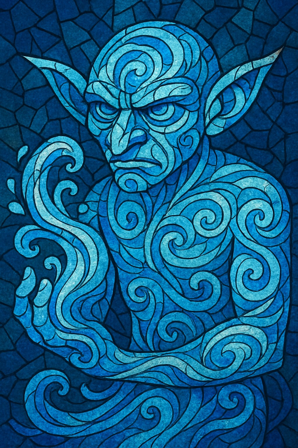 This digital abstract mosaic captures a striking depiction of a goblin figure infused with the essence of the water element. Rendered in cool shades of blue, teal, and white, the goblin’s form is constructed entirely from swirling, wave-like tessellations that ripple across its body, giving the illusion of fluid motion. Its sharp features and intense gaze are framed by elongated ears, while a powerful spiral of water rises from its raised hand, symbolizing command over aquatic forces.