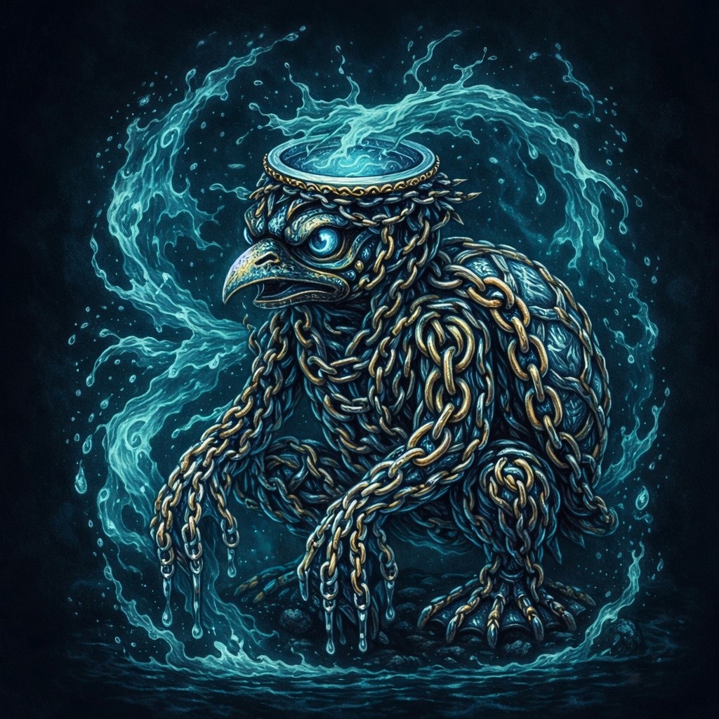 This striking illustration depicts a mystical kappa formed entirely from interwoven metallic chains, in shimmering silvery-blue and gold hues. The kappa’s body is turtle-like, while its head resembles a bird, with piercing glowing blue eyes. Surrounding the creature is a dynamic flow of turquoise water, splashing and dripping around it.