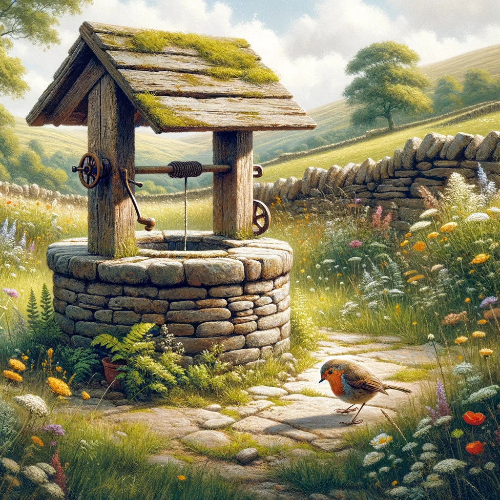 In the rustic countryside, a charming scene unfolds as a small bird pecks at the ground near an old, weathered stone well. Surrounding the well, the verdant countryside paints a picturesque backdrop, enhancing the tranquility of the moment. The bird’s presence adds a touch of natural grace to the rustic beauty of the scene, epitomizing the timeless charm of rural life.