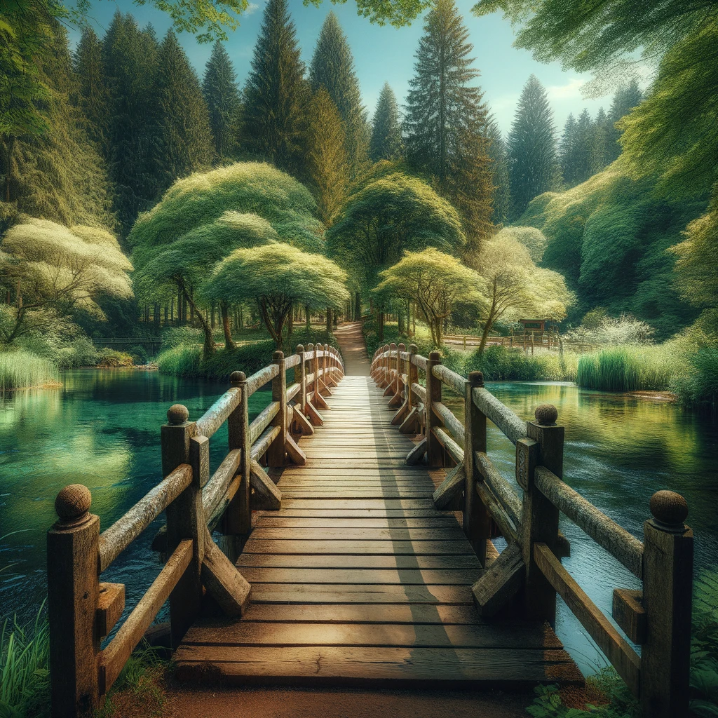A rustic wooden bridge spans a gently flowing river, nestled amidst lush greenery. Weathered planks, worn by time, lend charm to its structure, while mossy railings exude an inviting warmth. Surrounded by verdant foliage, the bridge serves as a tranquil passage, inviting contemplative walks amidst nature’s embrace.