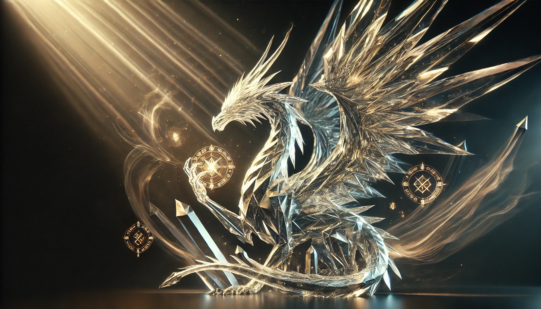 The image depicts a mesmerizing translucent crystal sculpture of a western dragon, designed with sharp, angular facets that resemble the geometric patterns of a diamond. The dragon’s powerful body is stretched in an elegant pose, with its wings spread wide in a grand, sweeping arc. Ethereal beams of light emanate from within the crystal, casting a soft, golden and white glow across its form.