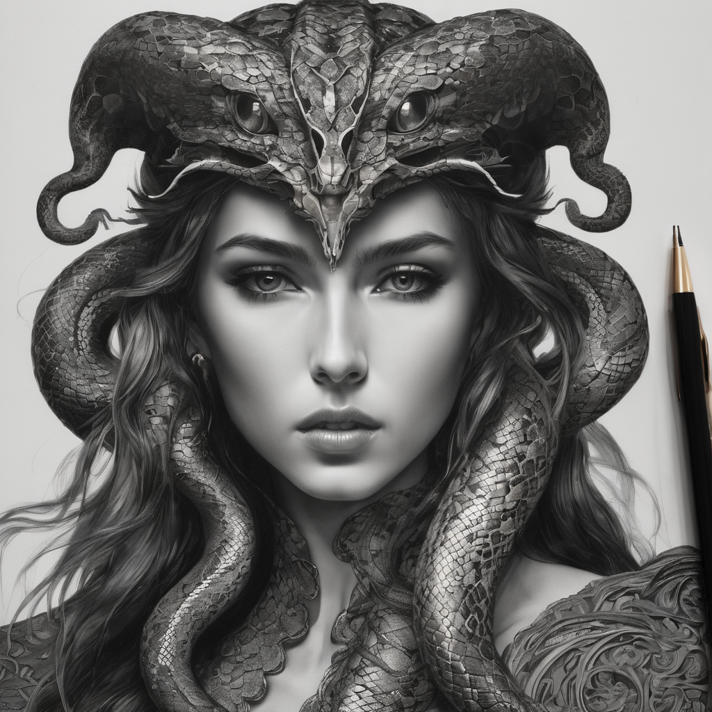 On paper, a woman’s likeness emerges, adorned with serpentine headgear that coils and weaves like living creatures. Each stroke of the pen captures the grace and power of her presence, as she gazes forth with enigmatic allure. The pen rests nearby, a silent witness to the artist’s skillful hand. In this rendering, beauty and mystery intertwine, inviting viewers to ponder the depths of the woman’s story and the artist’s imagination.