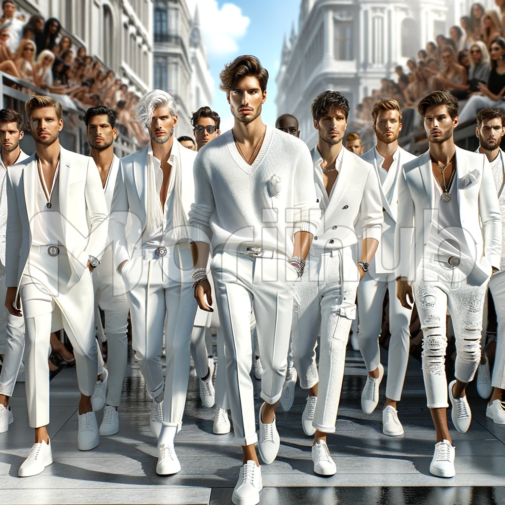 In this stylish and sophisticated scene, a group of impeccably dressed men, all clad in pristine white attire, exude an aura of confidence and poise as they confidently stride down a fashionable runway or a bustling city street. Each man’s outfit showcases a unique blend of sophistication and contemporary style, creating a visually captivating tableau that celebrates the epitome of modern elegance. The crisp white garments stand out against the backdrop, embodying a harmonious blend of fashion and confidence.