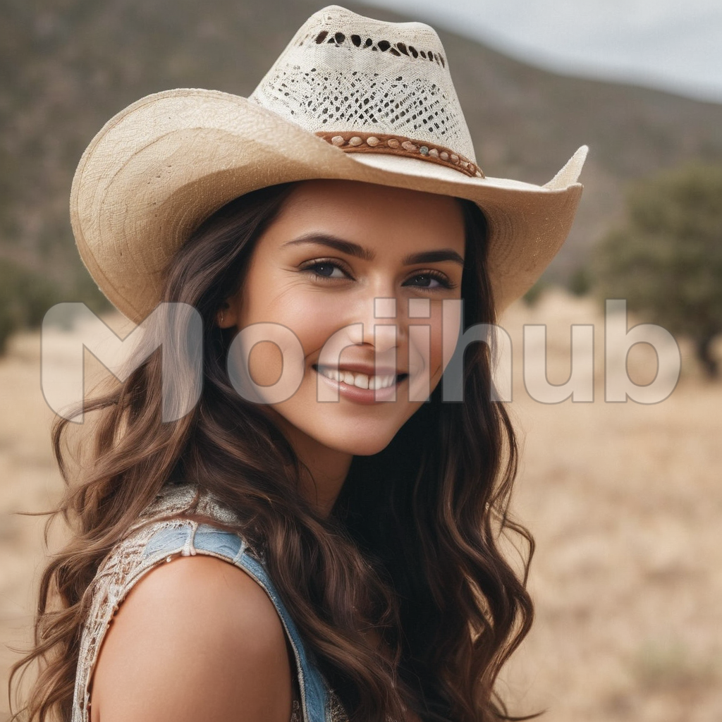 A beautiful woman, exuding confidence and charm, wears a classic cowboy hat, a symbol of free-spirited adventure. Her gaze turns towards the past, a hint of nostalgia in her eyes. A warm, genuine smile graces her lips, radiating both strength and grace. With her cowboy hat as a crown, she embodies the spirit of the wild west, a captivating blend of timeless beauty and frontier spirit that captures the heart.