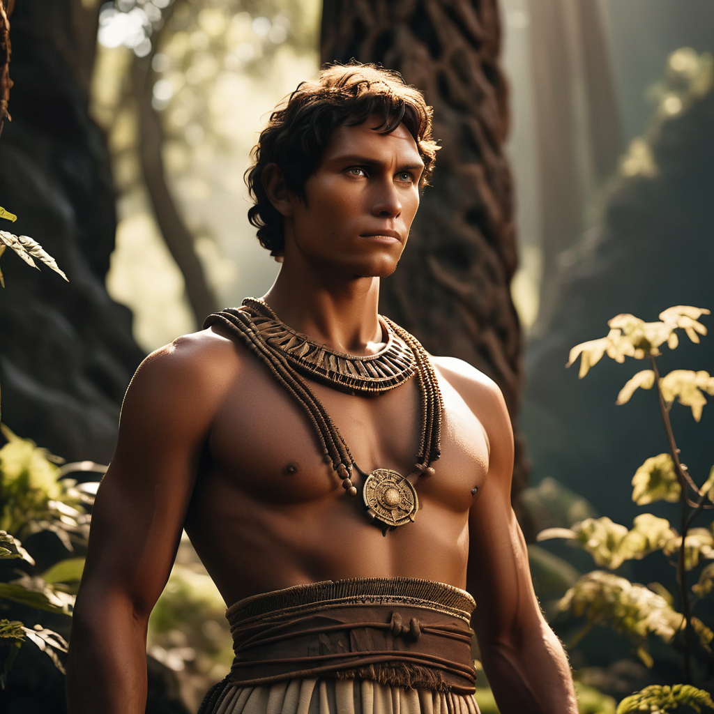 In the heart of the jungle, a bare-chested warrior stands, his muscles taut and eyes focused with unwavering intensity. The dense foliage surrounds him, echoing with the calls of unseen creatures. With each breath, he becomes one with the wild, attuned to every rustle and whisper in the undergrowth. In his gaze burns the fire of determination, as he stands ready to face whatever challenges the untamed wilderness may bring.