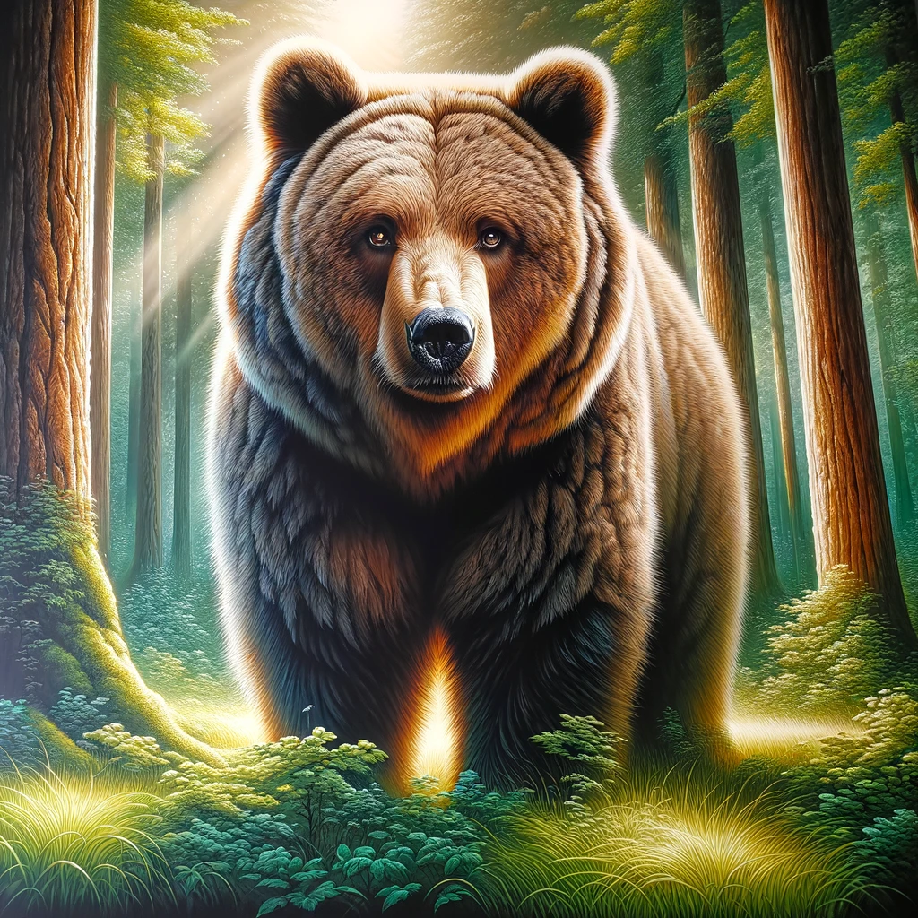 In this stunning and realistic painting, the majestic aura of a powerful bear comes to life with breathtaking detail. The bear stands tall and proud within a lush, untouched wilderness. Its fur, a testament to the artist’s mastery, showcases intricate textures and shades of brown and black. The forest background is a vibrant tapestry of deep greens and earthy tones, offering a compelling contrast to the bear’s imposing presence. Every brushstroke seems to convey the bear’s innate strength and dignity, making it a captivating tribute to the natural world’s magnificent beauty.