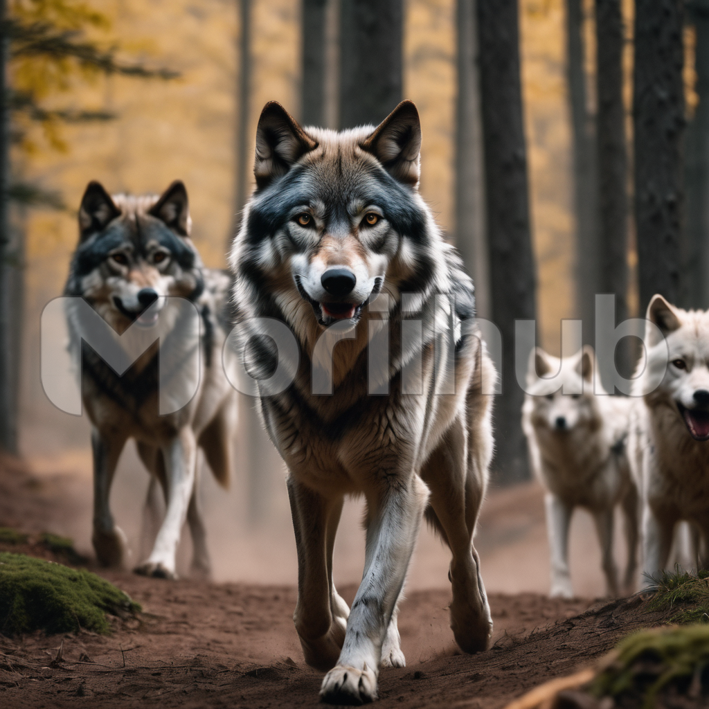 Amidst the ancient woods, a commanding wolf leads its pack with majestic authority. The pack follows in harmonious unity, their steps synchronized with the heartbeat of the wilderness. The leader, a symbol of strength and wild grace, strides purposefully, navigating the labyrinth of trees and shadows. The air is alive with the primal energy of the pack, a testament to the untamed spirit of the forest, as the wolves move as one through the enchanting depths.
