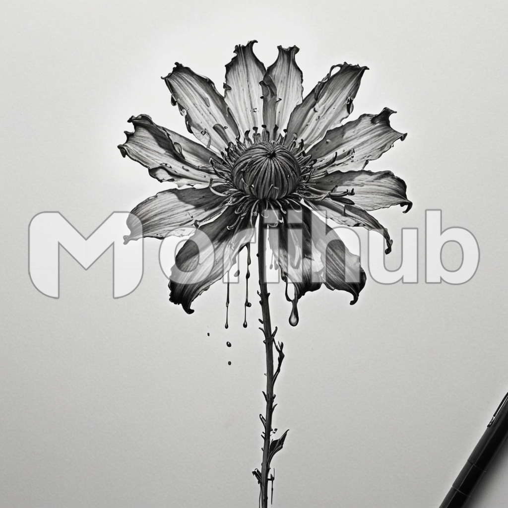 In the depths of the canvas, an ink painting portrays the solemn beauty of a wilted flower. Each delicate petal droops with graceful resignation, their vibrant colors muted to shades of sorrow. The stem, once proud and sturdy, now bows under the weight of time and decay. Despite its faded glory, the flower exudes a quiet dignity, a reminder of the transient nature of life’s beauty. In this poignant depiction, the wilted bloom stands as a solemn testament to the inevitability of change and the fleetingness of all things.