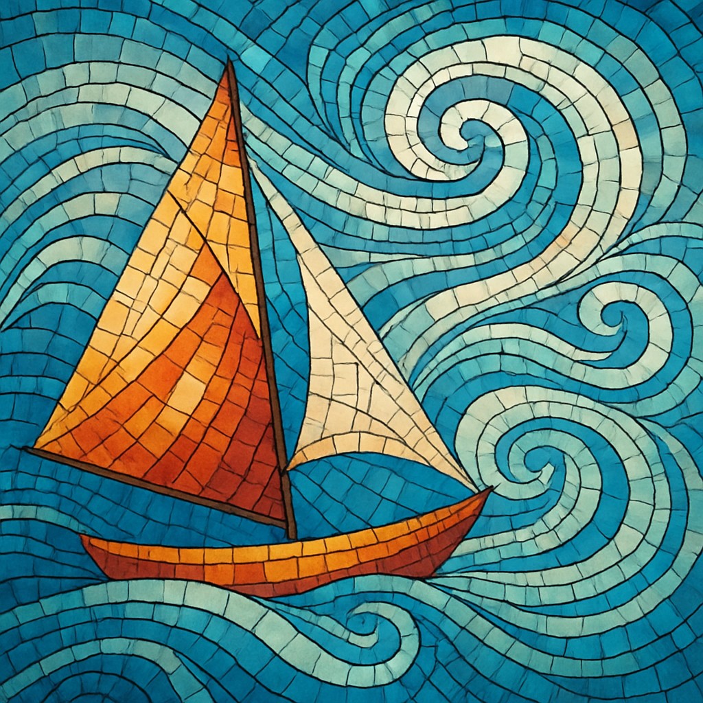 This image is a digital abstract mosaic depicting a sailboat surrounded by the element of wind. The boat is formed from warm-toned tiles (oranges and reds), while the surrounding background features cool blues and teals, arranged in flowing, swirling patterns to represent gusts of wind. The entire artwork mimics a stained glass aesthetic, with black outlines separating each individual tile, enhancing the mosaic effect.