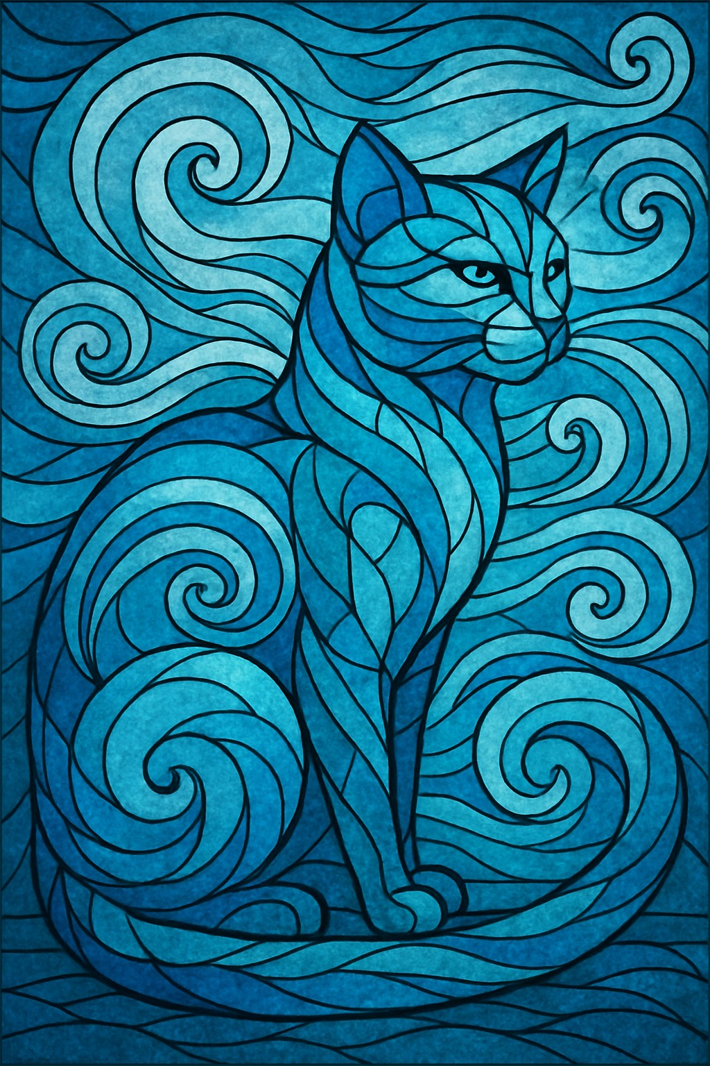 This image is a digital abstract mosaic artwork in the shape of a cat, designed to evoke the essence of the wind element. The cat is rendered using stained glass-style geometry, with swirling patterns and sharp, flowing lines that mimic gusts of wind. The color palette features cool tones—primarily shades of blue, teal, and turquoise—emphasizing a sense of movement and airiness.