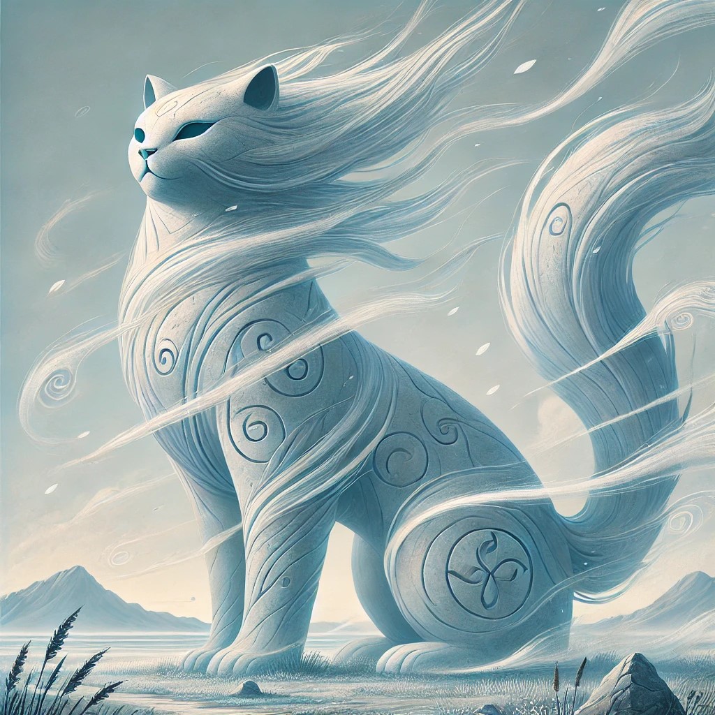 The image captures the wind cat totem standing gracefully on an open hillside, exuding an aura of freedom and fluidity. Crafted from smooth stone, this ethereal totem is adorned with flowing lines and symbols that evoke the essence of air and movement. Its translucent form seems to blend with the surrounding gusts, as if it is a part of the wind itself.