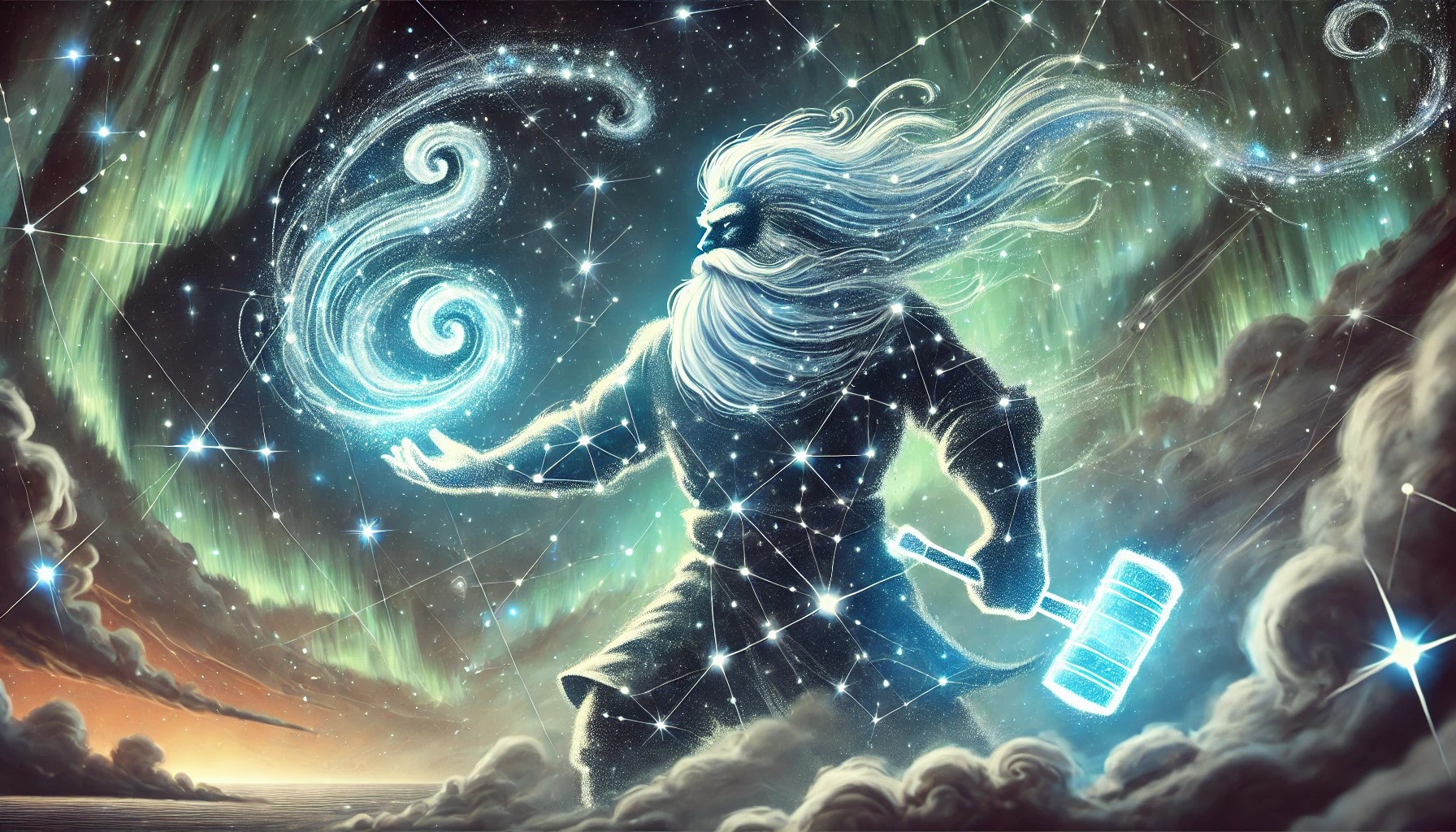 The dwarf’s figure is formed by bright stars connected by shimmering lines, outlining a broad-shouldered, stocky silhouette. The dwarf stands firmly with one arm outstretched, releasing a spiraling gust of wind, while the other hand rests on a glowing hammer. The background is a cosmic expanse filled with swirling nebulae in hues of turquoise, silver, and light blue, with countless twinkling stars scattered throughout.