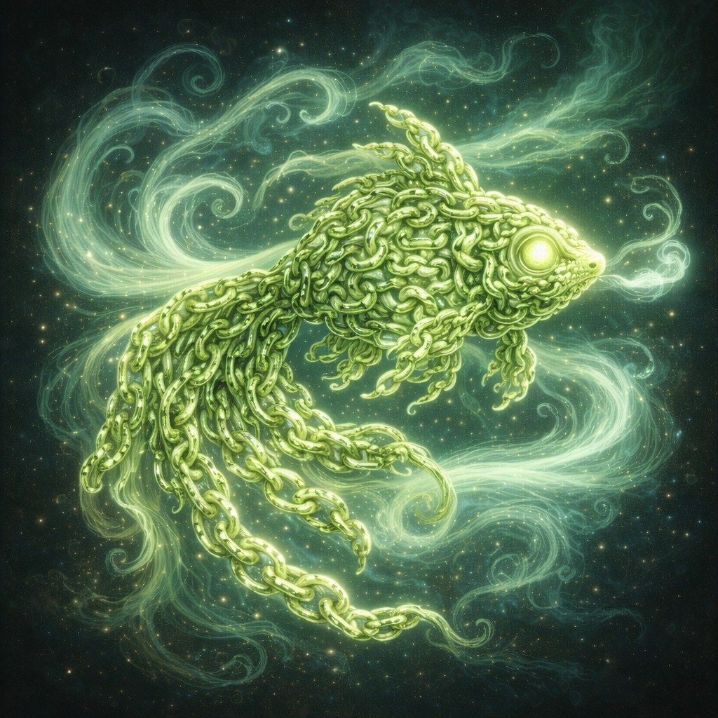 The image depicts a mystical goldfish formed entirely from luminous pale green chains, each link flowing seamlessly into the next, creating a delicate yet powerful form. Its body glows with a soft, ethereal light, the chains intertwining to form elegant fins that ripple with movement. Wisps of translucent wind energy swirl around the fish, adding a sense of fluid motion and ethereal grace.