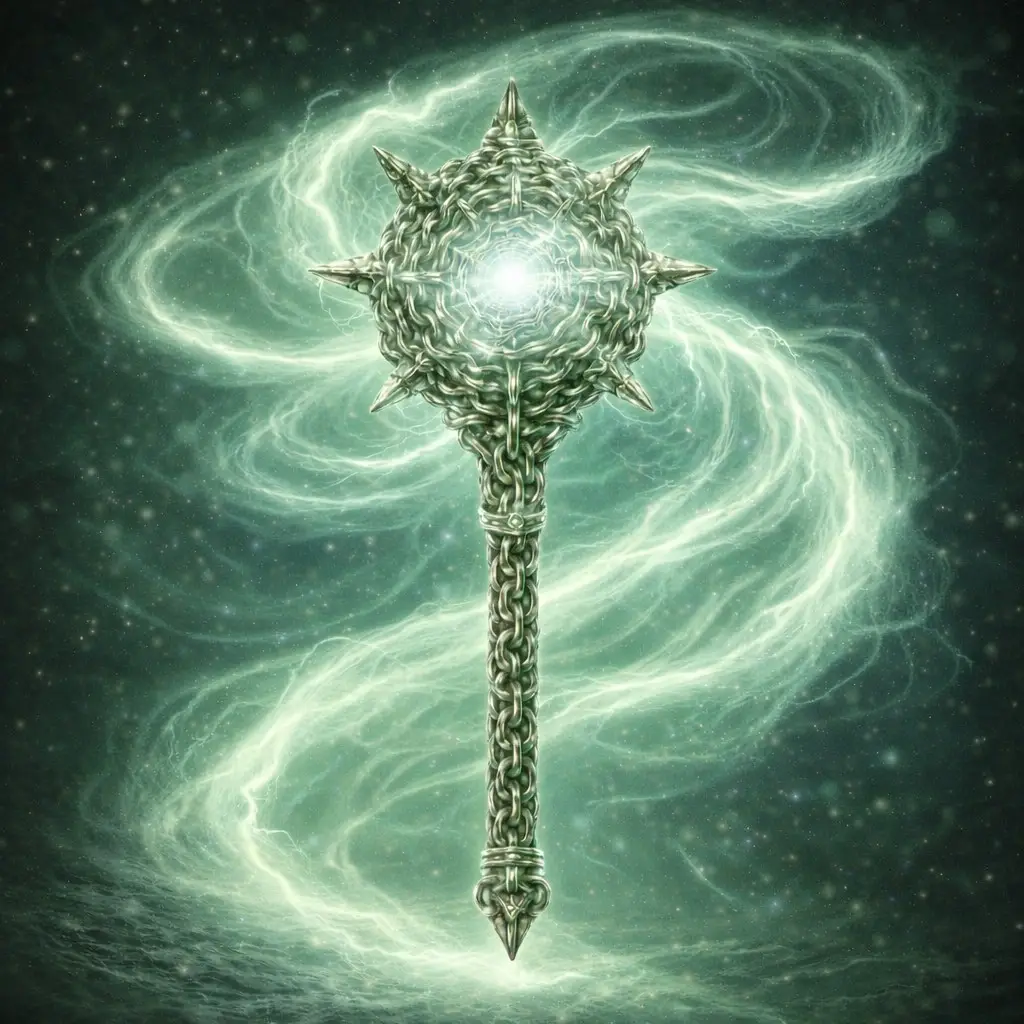 The mace, now reimagined with pale green hues, features a handle and spiked head constructed from intricately woven metallic chains. At the center of the spiked head lies a radiant orb of glowing white light, surrounded by a swirling wind-like energy. The ethereal pale green energy flows around the mace, emphasizing its connection to the wind element.