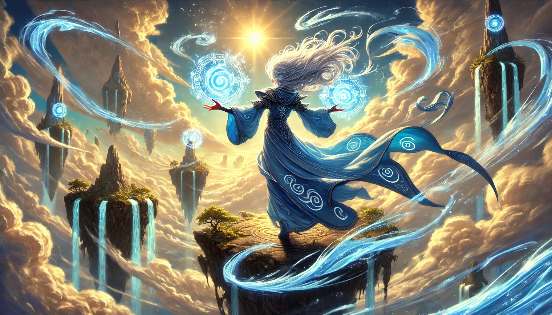 The image features a powerful wind mage standing atop a floating island high in the sky, summoning swirling currents of wind with their outstretched hands. Their sky-blue robes ripple wildly in the air, adorned with glowing runes that shimmer with arcane energy. Their silver hair flows effortlessly in the breeze, and their piercing white eyes glow with an ethereal light. Around them, magical wisps and gusts of wind swirl dynamically, forming intricate air patterns.
