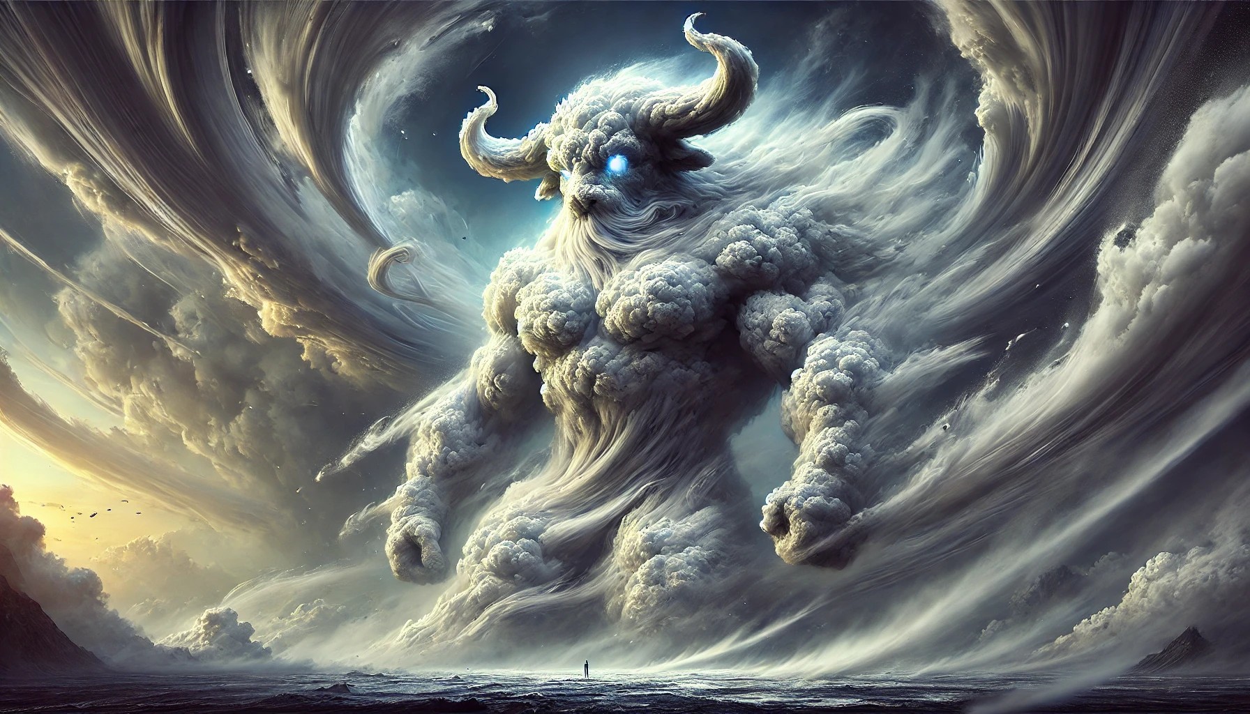 The image depicts a colossal Minotaur-shaped cloud standing amidst a swirling storm, exuding a powerful and commanding presence. Its muscular form is sculpted from billowing clouds, with misty tendrils shaping its strong limbs and curved horns. Wisps of air spiral around its body, creating an intense vortex of motion, as if the wind itself bends to its will.