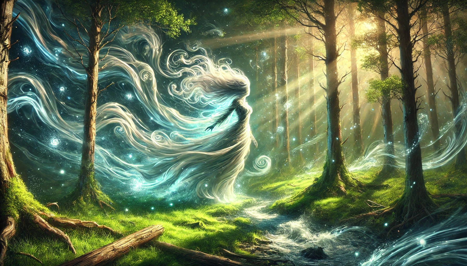 The image depicts a magical forest clearing bathed in soft, emerald-green and bluish tones, embodying the essence of the wind element. At the center stands a tall, ethereal wind spirit with flowing, translucent hair that merges seamlessly into the gusts of wind swirling around them. Their weightless, cloud-like robes ripple gracefully in the breeze.