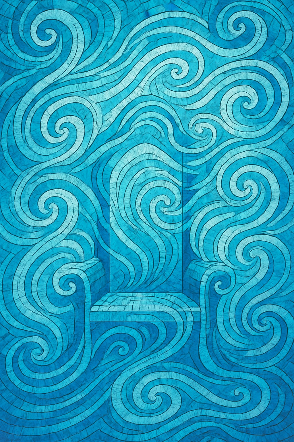 This artwork depicts a digital abstract mosaic in the form of a throne, crafted from flowing patterns that embody the essence of the wind element. The throne is outlined in graceful swirls of turquoise, blue, and white, resembling currents of air in constant motion. Each mosaic tile is shaped irregularly, evoking the organic and unpredictable nature of wind, while the stained-glass effect gives the piece a luminous, almost ethereal glow.